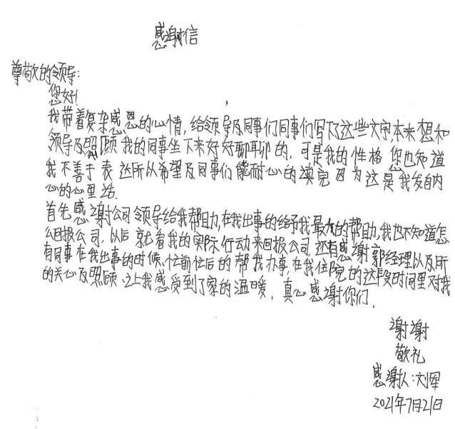 经过半个月治疗休养,刘军手部已无大碍。出院后的他写了一封感谢信并为公司送了一面锦旗,他说道,是南昌穆伟生鲜配送服务有限公司这个大家庭让他感受到了关怀和温暖,他表示要把这种关怀变成工作上的动力,争取早日返回工作岗位,努力工作,回报大家的关心和关爱。